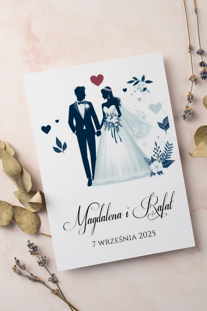 Zaproszenie ślubne składane – prostokątne. Zdjęcie jest poglądowe. Zmiany jakie możesz wprowadzić na zaproszeniu: